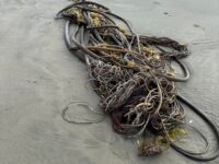 An unusually large bundle of kelp was deposited on the beach between the high and low tide line.