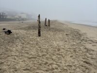 It was a foggy and gloomy morning at the beach with only about a dozen people and a handful of pups enjoying the cool beach breeze. It was so foggy that the horizon was not visible and you could feel the ocean mist in the air. The most notable difference on the beach walk was a new river that formed parallel to the shoreline. There were some ducks and seagulls enjoying the new river and people and pets minding their own business while the birds enjoyed a bath. Per usual, there was some human-made driftwood forts, some burned driftwood and other driftwood that was positioned erect in the sand.