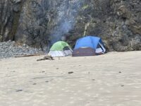 Apparent violations: 1 person with dog climbing up cliffside at the Capes; 3 persons digging in the cliff north of the tunnel.Disturbances: Shorebirds moving in response to humans/dogs