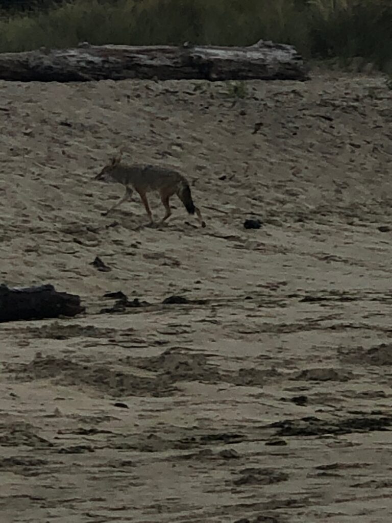 The beach has returned to slope from high banks earlier this year. Interesting to see the coyote that is unafraid of humans. I have seen dog-like footprints early in the morning previously along the wrack line for miles without accompanying human footprints. Now I believe they may have been from this coyote scouting food.
